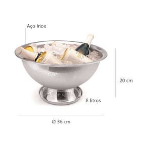 Muito prática, a peça acomoda bastante gelo e permite o repouso de variados tipos de bebidas, entre garrafas e latas, ou ainda apenas gelo para consumo. Possui formato redondo com belíssimo acabamento brilhante no lado externo e escovado na parte interna.