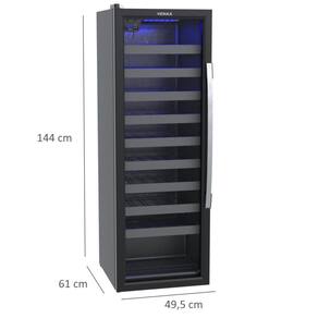 Tipo: Champanheira Marca: Venax Controlador de temperatura: Digital, regulável de -2C a 8C Sistema de refrigeração: Compressor Gás refrigerante: R134a Iluminação interna: Led azul Porta: Vidro duplo (LOW-E) Puxador da porta: Alumínio Abertura da porta: Direita para esquerda Trava de abastecimento: Não Aquecimento da porta: Sim Prateleiras: 9 Deslizantes e 1 fixa Evaporador: Sem ar forçado Gabinete interno: PSAI Gabinete externo: Aço revestido com pintura eletrostática Degelo: Automático Dreno: Traseiro Recipiente de degelo: Sim Pés: Frontais reguláveis e traseiros com rolete Capacidade de armazenamento: 50 Garrafas, diâmetro máximo 100mm Medidas do produto: Altura 144cm - Largura 49,5cm - Profundidade 61cm