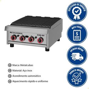 DESCRIÇÃO - Construída totalmente em aço inox, a Char Broiler CHB 60 G2 oferece alta resistência e fácil higienização. - Seus queimadores esmaltados garantem maior durabilidade, enquanto o acendimento por botão centelhador a pilha dispensa energia elétrica. - Os difusores de calor em ferro fundido proporcionam aquecimento rápido e uniforme. - Com registros de gás industriais tipo borboleta e grelhas em ferro fundido com angulação ideal, assegura grelhados perfeitos e escoamento eficiente da gordura. - Conta ainda com coletor superior com dreno e bandeja inferior que ocupa toda a base, facilitando a remoção de resíduos.