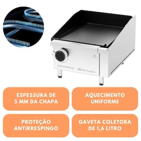 Com ampla área de fritura (40 cm), entrada de gás na parte lateral, chapa dobrada e gaveta de óleo inovadora.