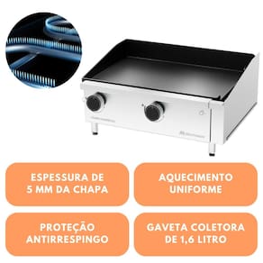 Com ampla área de fritura (40 cm), entrada de gás na parte lateral, chapa dobrada e gaveta de óleo inovadora.