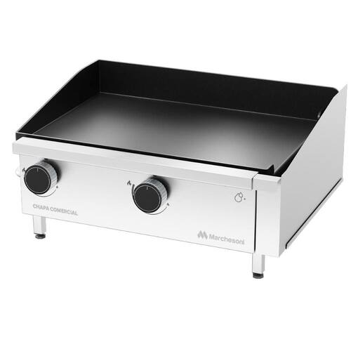 A Chapa Comercial a Gás Marchesoni 60cm 2 Queimadores CH.6.062 é a escolha ideal para estabelecimentos que buscam equilíbrio entre desempenho e espaço, como lanchonetes, food trucks e pequenos restaurantes. Seu design sem emendas com bordas infinitas elimina pontos de acúmulo de sujeira, garantindo limpeza prática e eficiente, enquanto a borda antirrespingo de 74 mm mantém o ambiente de trabalho limpo e organizado.