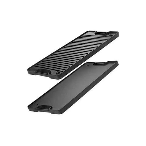 Chapa de ferro fundido dupla-face retangular com 50 cm de comprimento x 25 cm de largura.