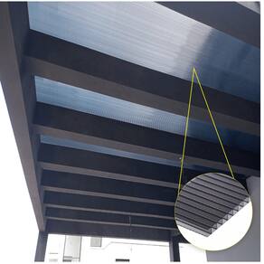 O policarbonato Alveolar é uma chapa, com aspecto de vidro canelado, que possui cavidades ocas que reduzem significativamente seu peso. Trata-se de um material leve e resistente, perfeito para aplicações que demandam iluminação natural. Além disso, conta com tratamento UV em uma das faces, prolongando sua durabilidade e reforçando a resistência contra o amarelamento. Possui garantia de 10 anos contra amarelamento e ressecamento da peça, desde que sejam seguidas as recomendações de instalação do fabricante.