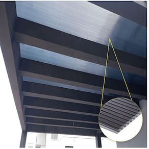 O policarbonato Alveolar é uma chapa, com aspecto de vidro canelado, que possui cavidades ocas que reduzem significativamente seu peso. Trata-se de um material leve e resistente, perfeito para aplicações que demandam iluminação natural. Além disso, conta com tratamento UV em uma das faces, prolongando sua durabilidade e reforçando a resistência contra o amarelamento. Possui garantia de 10 anos contra amarelamento e ressecamento da peça, desde que sejam seguidas as recomendações de instalação do fabricante.