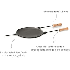 A Chapa Disco Churrasqueira Redonda Cabo de Madeira da Panela Mineira possui um design rústico e autêntico, com base lisa e abaulada, além de três pezinhos horizontais para dar suporte e estabilidade ao ser colocada em uma estrutura reta. Ideal para preparar fritar, selar e grelhar carnes, legumes, peixes e outros alimentos, de maneira prática e eficiente. Sua excelente distribuição e retenção de calor, característico do ferro fundido, mantém os alimentos aquecidos por muito mais tempo, além de enaltecer seus sabores e aromas. Pode ser utilizada diretamente sobre todas as fontes de calor, assim como churrasqueiras. Possui cabos parecidos com espetos de churrasqueira. São dois na parte inferior (38cm) e 1 na parte superior (15cm).