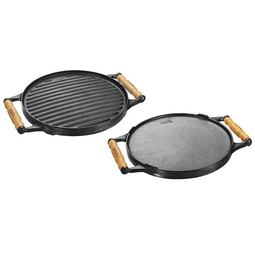Chapa de ferro fundido dupla-face com 30 cm diâmetro, medida não inclui as alças que medem 3 cm de cada lado. Pode ser utilizada dos 02 lados sendo que um dos lados tem a chapa toda lisa e o outro lado a chapa é estriada para preparar grelhados. Marca Panela Mineira. Alças em madeira. Deve ser utilizada diretamente sobre a chama do fogão a gás, a lenha, elétrico ou de indução.