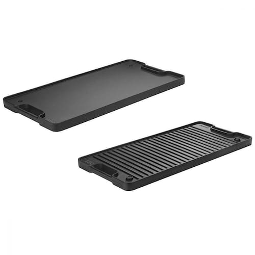 Chapa de ferro fundido dupla-face retangular com 50 cm de comprimento x 25 cm de largura. Deve ser utilizada diretamente sobre a chama do fogão a gás, a lenha, elétrico ou de indução, e também em churrasqueiras. Pode ser utilizada dos 02 lados sendo que um dos lados tem a chapa toda lisa e o outro lado a chapa é estriada para preparar grelhados. Características do Produto: Material feito de Ferro Comprimento: 50 cm Largura: 25 cm Alça: Ferro Peso: 5,3 kg Itens inclusos: 01 Chapa Dupla Face alça espiral 50 cm x 25 cm Código: 750