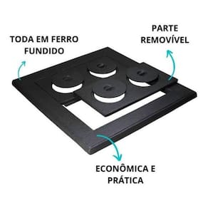 PRODUTO: 1 Chapa 4 Furos, 4 Tampas e 2 Quadros. MEDIDAS: 49cm de comprimento x 47cm de largura. Espessura da chapa: 6mm no meio e 1cm na borda. Diâmetro dos Furos: 12cm. PESO TOTAL: 10Kg. MATERIAL: Ferro Fundido. UTILIZAÇÃO: Construção de fogão à lenha. Quer tornar seu ambiente elegante e econômico A Chapa 4 Furos Econômica torna seu sonho de ter um ambiente super confortável, aquecido e com um toque rústico tradicional realidade. Ela possui alta durabilidade e qualidade, além de reter muito bem o calor.
