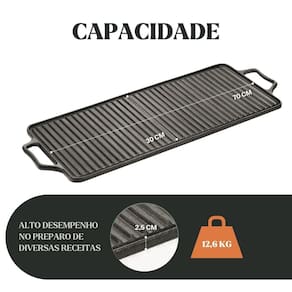 Modelo: Chapa Estriada Retangular Alça de Ferro 70x30x2,5cm Material da peça: ferro fundido Material da alça: ferro Medidas: 70 × 30 × 2,5 cm Peso aproximado: 12,6 kg Compatível com fogão: indução, gás, elétrico, vitrocerâmico, lenha, forno Já vai curada. Pronta para uso Revestimento atóxico camada protetora Garantia: 90 dias contra defeitos de fabricação A Chapa Estriada Panela Mineira proporciona grelhados com marcas tradicionais, realçando sabor e textura. Ideal para carnes, linguiças, filés, legumes e hambúrgueres. O ferro fundido puro garante calor uniforme e vedação perfeita, produzindo resultados profissionais em qualquer ambiente. Ideal para bares, hotéis, pousadas, restaurantes, buffets e cozinhas de alta demanda. CONTEÚDO DA EMBALAGEM 1x Chapa Estriada Retangular Alça de Ferro 70x30x2,5cm CUIDADOS APÓS O USO Lave com água e sabão neutro Seque ao fogo Aplique óleo Guarde em local seco CURA DO PRODUTO Lave e remova oxidação Seque ao fogo Aplique óleo Aqueça 15 minutos Repita conforme necessário IMAGENS MERAMENTE ILUSTRATIVAS