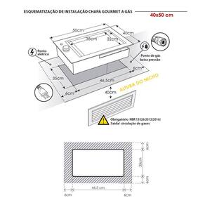 A chapa gourmet atinge temperaturas elevadas, e portanto não deve ser instalada sobre ou próxima de materiais inflamáveis e sensíveis ao calor, como eletrônicos, MDF, MDP, madeiras, laminados, tecidos, couro, plásticos e materiais sintéticos. A instalação deve ser feita em nicho previamente preparado na bancada de pedra (Mármore, Granito, Quartzo, Venato, entre outras), que deve ser cortada com os cantos arredondados para evitar pontos de fragilidade. Além disso, a chapa a gás necessita de um nicho com altura mínima de 40 cm e ventilação para a circulação de gases.