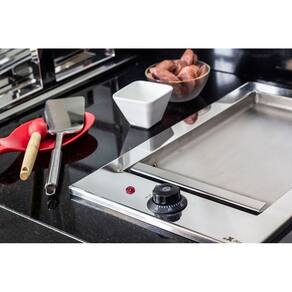Disponível em duas voltagens diferentes (110V ou 220V), conta com um coletor de gordura removível e é fabricada em aço inox 304, o que aumenta a durabilidade do produto e faz com que a chapa seja resistente à corrosão. Sua temperatura máxima é atingida em até 10 minutos e a instalação é feita por encaixe, sem necessidade de fixação por parafusos, buchas ou colas; basta embutir a chapa na bancada, em nicho previamente preparado. O compartimento coletor de resíduos facilita a limpeza do produto e seu design moderno faz com que a chapa se integre na decoração com harmonia, embelezando sua cozinha, varanda ou área gourmet.