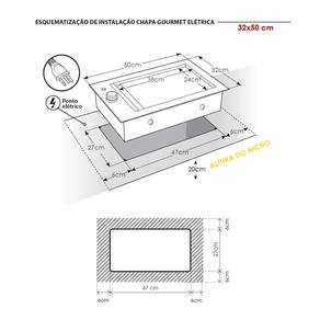 A chapa gourmet atinge temperaturas elevadas, e portanto não deve ser instalada sobre ou próxima de materiais inflamáveis e sensíveis ao calor, como eletrônicos, MDF, MDP, madeiras, laminados, tecidos, couro, plásticos e materiais sintéticos. A instalação deve ser feita em nicho previamente preparado na bancada de pedra (Mármore, Granito, Quartzo, Venato, entre outras), que deve ser cortada com os cantos arredondados para evitar pontos de fragilidade.