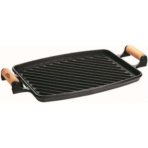 A Chapa de Ferro Fundido Grill Retangular pode ser adquirida: com alça de madeira.
