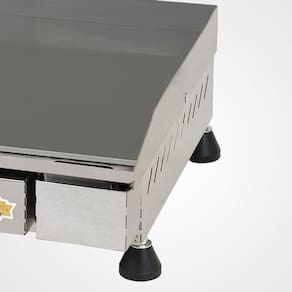Fabricadas em aço inox escovado, as Chapas da linha Comercial possuem queimadores em alumínio que não enferrujam, botões reguláveis da vazão de gás e gaveta coletora de óleo.