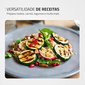 CHAPA LISA + GRILL: O Due Grill é composto por chapa lisa e grill e permite preparar diversos tipos de pratos. As chapas são perfeitas para vegetais, pães e carnes. Já o grill é indicado para hambúrgueres e espetinhos.