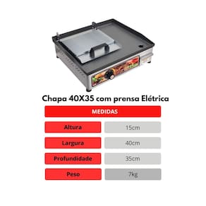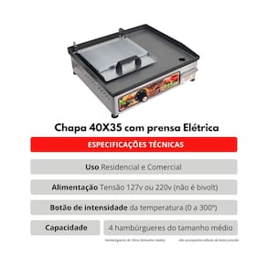 Chapeira Elétrica com Abafador 40x35cm Galvanizada Pratic Se você procura uma chapeira elétrica prática, rápida e eficiente para preparar lanches em casa, essa versão 40x35 é ideal. Compacta e econômica, ela oferece aquecimento uniforme, fácil manuseio e ótimo desempenho no preparo de hambúrgueres, grelhados e porções. Sua estrutura é feita em aço galvanizado, com chapa superior em aço carbono de 2,6 mm, mais resistente a altas temperaturas. A resistência interna é bem distribuída e conta com termostato regulável de 0º a 300?°C, garantindo controle total sobre o preparo. Acompanha abafador, que ajuda a manter o calor e agiliza o cozimento dos alimentos. Possui gaveta coletora de resíduos com puxador, que facilita a limpeza, além de pés antiderrapantes que proporcionam mais segurança durante o uso. O LED indicador mostra quando a chapa está ligada, desligando automaticamente ao atingir a temperatura ideal. Dimensões: 40 cm (largura) x 35 cm (profundidade) x 15 cm (altura) Peso: 7 kg Essa chapeira serve para comércio? Não. É indicada para uso residencial. É antiaderente? Não, mas é fácil de limpar com a gaveta de resíduos e abafador. Qual a voltagem? Disponível em 127?V ou 220?V (escolha no momento da compra). É fácil de usar? Sim, tem termostato de 0 a 300?°C, LED indicador e estrutura segura. Cabe quantos hambúrgueres? Até 4 hambúrgueres de 10 cm por vez. Garantia 3 meses contra defeito de fabricação