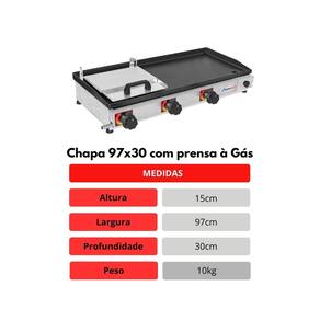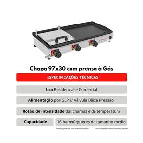Chapeira Industrial com Prensa à Gás 97x30cm Galvanizada Pratic Se você busca uma chapeira com prensa espaçosa, prática e eficiente para preparar lanches com rapidez, a versão 97x30 é uma excelente escolha. Indicada tanto para uso residencial quanto comercial, ela entrega ótimo desempenho, segurança e economia no preparo de hambúrgueres, porções e grelhados. A estrutura é feita em aço galvanizado, com gaveta coletora de resíduos em inox e base emborrachada para garantir firmeza no uso. A chapa superior em aço carbono aquece de forma uniforme, graças aos 4 queimadores bem distribuídos por toda a extensão da chapa. Acompanha prensa com cabo anatômico, que facilita a finalização dos lanches com praticidade. O acendimento é manual com sistema de gaveta, garantindo mais segurança. Possui controle de temperatura com 5 níveis de ajuste e dois recipientes coletores de resíduos, que facilitam a limpeza após o uso. É potente, durável e pronta para funcionar com gás GLP de baixa pressão. Dimensões: 97 cm (largura) x 30 cm (profundidade) x 15 cm (altura) Peso: 10 kg Essa chapeira serve para comércio? Sim, ideal para lanchonetes, trailers, cafés ou uso residencial intensivo. Funciona com gás de cozinha comum? Sim, utiliza GLP com válvula de baixa pressão (não inclusa). A chapa é antiaderente? Não, mas é fácil de limpar com os recipientes coletores. É fácil de usar? Sim, possui acendimento manual, regulagem da chama e prensa ergonômica. Cabe quantos hambúrgueres? Até 16 hambúrgueres de 10 cm por vez. Garantia 3 meses contra defeito de fabricação