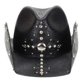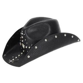 Chapéu Pralana modelo exclusivo João Carreiro & Capataz, fabricado com fibras de celulose no estilo palha cor Preta, aba de 9cm, copa de 10cm, detalhes em rebites de metal, cruz em recouro na copa com strass e rebites e carneira de elástico.