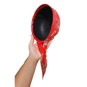 Chapéu de pirata bandana estruturado porém bastante confortável, leve e maleável tipo casco com nó. Pode ser utilizado com o nó para o lado ou para trás. Cor: Vermelho com caveiras prata. Tam. Aprox. 19 X 19cm Marca: Casa João E Maria