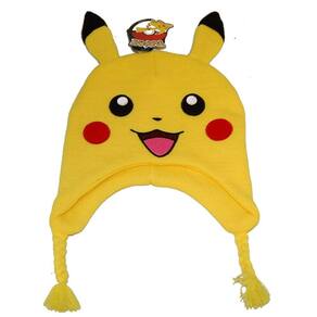 Esse chapéu Pikachu é mais do que fofo. Um chapéu amarelo brilhante com grandes olhos de Pikachu em preto e branco, olheiras vermelhas e nariz e boca pretos. As orelhas amarelas de Pikachu com pontas pretas se destacam do topo. Cordas trançadas amarelas pendem de cada lado