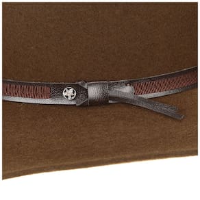 Chapéu Pralana fabricado em feltro 100% lã, cor café, aba de 7cm e copa de 11,5cm, carneira de elástico, banda de recouro com detalhe em fita de nylon e margaridas de metal. Fino acabamento.
