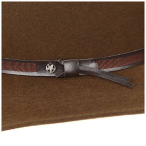 Chapéu Pralana fabricado em feltro 100% lã, cor café, aba de 7cm e copa de 11,5cm, carneira de elástico, banda de recouro com detalhe em fita de nylon e margaridas de metal. Fino acabamento.