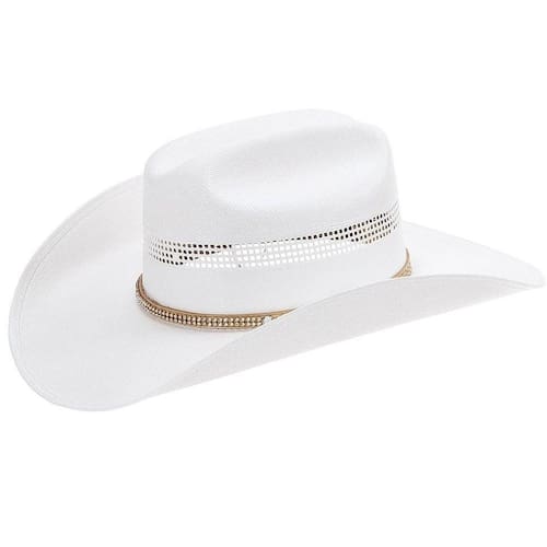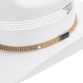Chapéu Mundial modelo Americano Twister, fabricado com Fibras Têxteis estilo Palha na cor Branca, possui carneira de elástico e bandinha de couro com detalhes em bordado e strass.