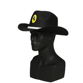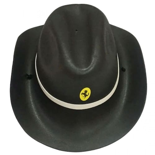Cor: Preto, com uma faixa branca e um emblema amarelo e preto (que parece ser o logo da Ferrari) na lateral.