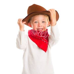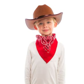 Antes que ele vá ao pôr do sol, certifique-se de que o seu pequeno caubói está vestido com um equipamento rústico autêntico. O conjunto de chapéu de caubói marrom e bandana é uma ótima maneira de incentivar o seu pequeno cavaleiro a protegê-lo do calor que ele está correndo no gado. - Chapéu de caubói – Bandana