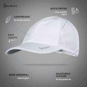 Chapéu de secagem rápida — este chapéu de corrida feminino manterá você confortável durante toda a corrida. Nosso chapéu de corrida feminino é 97% poliéster, 3% elastano.
