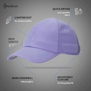 Chapéu de secagem rápida — este chapéu de corrida feminino manterá você confortável durante toda a corrida. Nosso chapéu de corrida feminino é 97% poliéster, 3% elastano.