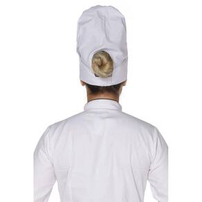 O chapéu de cozinheiro(a) possui ajuste em elástico na parte posterior.