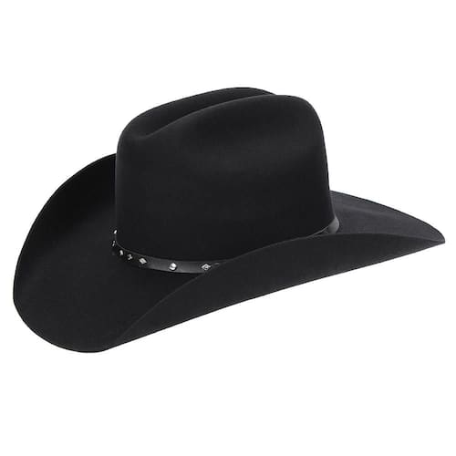 Chapéu Pralana modelo Arizona III, fabricado em Feltro 100% Lã cor Preto, repelente à água, aba de 10cm e copa de 11cm, banda em material sintético com detalhes em rebites e carneira de recouro.