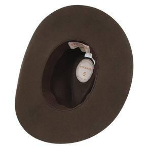 Chapéu Stetson fabricado em Feltro na cor Tabaco, possui aba de 9cm e copa social de 10cm, bandinha de material sintético com boton e carneira de elástico.