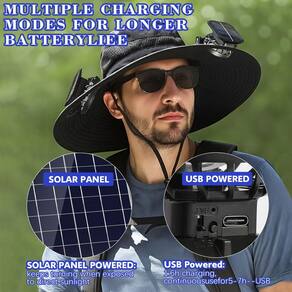 - ?Sistema de ventilador de alimentação dupla?Este chapéu oferece opções versáteis de carregamento via energia solar externa ou USB. Desfrute de três velocidades de ventilador para até 16 horas de uso contínuo, proporcionando maior conforto durante atividades ao ar livre.