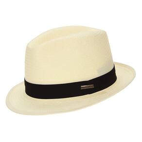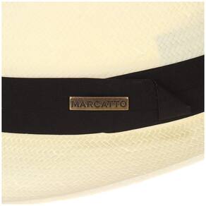 Chapéu Marcatto, fabricado com fibras de celulose estilo palha cor Marfim, aba de 5cm, copa de 10cm, banda em tecido trabalhado com detalhe em boton de metal personalizado da marca e carneira de espuma com acabamento em tecido. Fino acabamento.