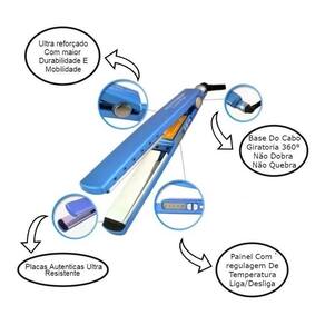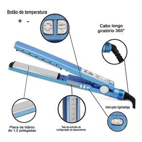 Prancha com design moderno, placas em titânio ideal para processos químicos. Suportam temperaturas muito altas e ajudam a manter a umidade natural do cabelo e proporcionar mais brilho.