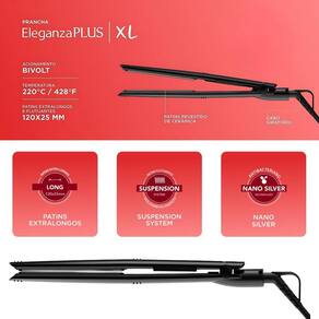 Prancha Eleganza Plus XL Bivolt: Seu Segredo para Cabelos Impecáveis Se você busca um alisamento perfeito, duradouro e com o máximo cuidado para seus fios, a Prancha Eleganza Plus XL Bivolt é a escolha ideal. Como especialista em e-commerce com mais de duas décadas de experiência, sei que a primeira impressão é a que fica, e este produto entrega não apenas beleza, mas também a confiança de um cabelo saudável e radiante. Prepare-se para descobrir todos os detalhes que fazem dela um item indispensável em seu dia a dia. Temperatura Máxima de 220C / 428F: Atinge a temperatura ideal para um alisamento eficaz e duradouro, adaptando-se a diversos tipos de cabelo. Revestimento de Cerâmica: Os patins revestidos em cerâmica proporcionam um deslizamento suave e uniforme, minimizando o atrito e protegendo os fios contra danos causados pelo calor excessivo. Tecnologia Antifrizz: Essa funcionalidade revolucionária atua mantendo a umidade natural do cabelo enquanto sela as cutículas capilares. O resultado Cabelos visivelmente mais saudáveis, sedosos, com um brilho intenso e, claro, completamente livres do temido frizz. Tecnologia Nano Silver: Uma barreira protetora contra bactérias. As nanopartículas de prata presentes no revestimento dos patins eliminam microrganismos, promovendo um ambiente mais higiênico para seus cabelos e contribuindo para sua saúde geral. Suspension System Patins Flutuantes : Os patins extralongos 120x25 mm são flutuantes, o que significa que se ajustam perfeitamente à mecha de cabelo. Isso garante uma pressão uniforme em todo o comprimento do fio, resultando em um alisamento mais eficiente, rápido e sem marcas indesejadas. Patins Extralongos 120x25 mm: O tamanho diferenciado dos patins permite abranger uma maior quantidade de cabelo por passada, otimizando o tempo e tornando o processo de alisamento mais ágil. Design Ergonômico: Pensada para o conforto, a prancha possui um formato que se encaixa perfeitamente na mão, proporcionando maior controle e reduzindo a fadiga durante o uso prolongado. Cabo Giratório: Oferece total liberdade de movimento, evitando que o cabo enrole e facilitando o manuseio da prancha em qualquer ângulo. Bivolt Automático: Uma funcionalidade essencial para quem viaja ou precisa de praticidade. A prancha se adapta automaticamente à voltagem do local 127V ou 220V , sem a necessidade de adaptadores ou preocupações com a voltagem da tomada. Cabelos Alisados com Perfeição e Durabilidade: Diga adeus aos retoques constantes. Seu cabelo liso permanecerá impecável por muito mais tempo. Fios Saudáveis e Protegidos: As tecnologias Antifrizz e Nano Silver, aliadas ao revestimento de cerâmica, garantem que seus cabelos sejam alisados sem sacrificar a saúde e a integridade da fibra capilar. Adeus ao Frizz: Tenha cabelos alinhados, sedosos e com um brilho espelhado, mesmo em dias úmidos. Praticidade e Agilidade: Os patins extralongos e o aquecimento rápido otimizam seu tempo, permitindo um alisamento eficiente em menos passadas. Conforto no Manuseio: O design ergonômico e o cabo giratório tornam o uso da prancha uma tarefa fácil e agradável, mesmo para quem não tem muita experiência. Versatilidade para Viagens: Graças à função bivolt, você pode levar sua Prancha Eleganza Plus XL para qualquer lugar do mundo, mantendo seu visual impecável em todas as suas viagens. Ficha Técnica Completa Produto: Prancha Eleganza Plus XL Tecnologias: Suspension System, Nano Silver, Antifrizz Nano Silver: Sim Suspension System: Sim Voltagem: Bivolt automático Plug: 10A - 250V - Plug hexagonal - Pino Redondo de 4,0mm Temperatura Máxima: 220C / 428F Revestimento dos Patins: Cerâmica Potência: 40 - 47 W Dimensões do Produto: 3 cm Largura x 3 cm Altura x 35 cm Comprimento : 6 meses Características Adicionais: Patins extralongos 120x25 mm, Cabo giratório Itens Inclusos 1 Prancha Eleganza Plus XL Bivolt