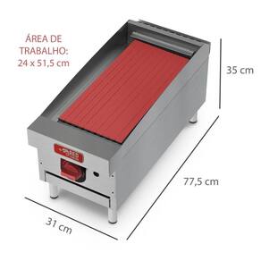 O Chair Broiler CHB01 é uma churrasqueira compacta com área de trabalho de 24x52cm e um queimador de gaveta, ideal para pequenos preparos, podendo ser usada também em residencias. Este equipamento possui laterais em aço inox com proteção térmica que permite encostar nas laterais sem risco de queimadura. Possui uma grelha de ferro fundido e uma chapa com consumo de gás de 275 gramas/h e potência de 10.600 BTU/h. Um excelente produto para se ter tanto em casa e preparar aquele churrasco super prático e rápido quanto para casas de carnes, restaurantes e churrascarias.
