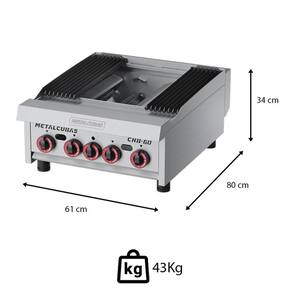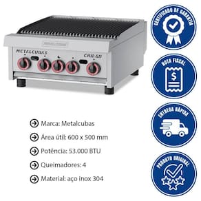 INFORMAÇÕES DO CHAR BROILER A GÁS METALCUBAS CHB60 - Área útil: 600 x 500 mm - Consumo: 1,1 Kg/h - Potência: 53.000 BTU - Peso liq. : 43 Kg - Dimensões ( A x L x C): 340 x 800 x 610 mm - Número de Queimadores: 4