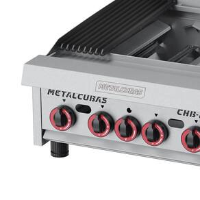 DESCRIÇÃO DO CHAR BROILER A GÁS METALCUBAS CHB60 - Construído totalmente em aço inox que permite uma ampla higienização sem danificar as partes do equipamento. - Queimadores esmaltados que garantem maior durabilidade e facilidade na limpeza do mesmo. - Difusores de calor em aço inox 304 permitem uma melhor e mais rápida distribuição do calor gerado pelos queimadores, por se tratar de um aço sem presença de carbono evita a corrosão ocasionada pelo contato da gordura com o sal. - Registros de gás industriais tipo borboleta garantem a absorção do esforço excessivo na utilização diária. - Coletor de gordura superior removível para remoção rápida da gordura que escorre pelas grelhas. Bandeja coletora de resíduos inferior ocupa toda a base do equipamento, garantindo assim que todos os resíduos que caem entre as grelhas sejam amparados e facilmente descartados