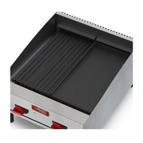 Gabinete em aço inox Grelhas em ferro fundido Queimadores esmaltados com controle individual de chama Sistema de radiação de calor através de defletor Gaveta coletora de gordura Acompanha uma chapa lisa de ferro fundido Isolamento em lã de rocha Pés com regulagem de altura Área de Trabalho: 480 x 515mm Queimadores: 2 Consumo: 530 g/h Potência: 21.200 BTU/h Pressão de Trabalho (GLP): 280mm.CA Dimensões: 350mm(A) x 550mm(L) x 775mm(P) Marca: Red Chameleon