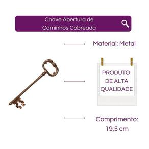 Chave Abertura de Caminhos Cobreada 19,50 cm em Metal Esta Chave serve para abrir caminhos, atrair energias positivas para sua vida e também trazer mais proteção espiritual para sua vida e contra invejas. Tem o poder de transmutar energias. Descrição Conteúdo da embalagem: uma chave. Dimensões aproximadas do produto: Largura total: 5,50 cm Comprimento total: 19,50 cm Peso aproximado: 100 g Material: Metal Tire todas as suas Dúvidas antes de concluir a compra. Iremos responder o mais breve possível. Embalagem de Envio: Caixa de papelão ondulado, plástico bolha, conforme necessidade do produto. Ótima resistência e durabilidade. Respostas das dúvidas mais frequentes na ordem: R1: Já realizamos milhares de entregas em todo o Brasil, somos especialistas no que fazemos. R2: Assim que seu pedido for despachado, esta plataforma envia para você o código de rastreamento. R3: Enviamos o produto 100% inspecionado e conferido em nosso checkout e são embalados em embalagem de papelão e plástico bolha. R4: O tempo de entrega irá depender totalmente do seu CEP, todos os nossos produtos saem de Capital. R5: Iremos despachar o seu produto o mais rápido possível, assim que for confirmado pela plataforma, enviamos em até 24h. R6: Nós queremos a sua satisfação, qualquer problema iremos te auxiliar em nossos canais de comunicações Marca: Não Informado
