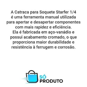 As imagens são meramente ilustrativas a catraca para soquete starfer 1/4 é uma ferramenta manual utilizada para apertar e desapertar componentes com mais rapidez e eficiência. Ela é fabricada em aço-vanádio e possui acabamento cromado, o que proporciona maior durabilidade e resistência à ferrugem e corrosão.