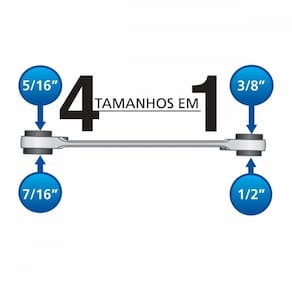 Acabamento cromado.Catraca fosfatizada reversível.72 dentes.Torque Máximo (N.m): 5/16" = 33,85; 3/8" = 51,87; 7/16" = 74,41; 1/2" = 101,69;As chaves de aperto são produzidas em aço ligado com cromo vanádio (Cr-V), e apos submetidas a testes rigorosos de torque para atender a norma DIN 1711-1.O teste de dureza é realizado em vários pontos para assegurar a resistência ao desgaste da chave durante o uso ininterrupto.Devido à incorporação de um mecanismo com catraca, esta ferramenta permite realizar trabalhos com mais agilidade e facilidade do que uma chave estrela comum.Construção robusta que permite dar apertos finais.As ferramentas são produzidas e testadas conforme normas específicas.