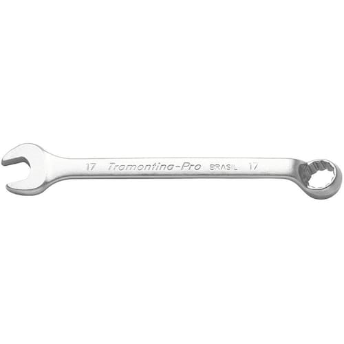 Ideal para apertar e afrouxar parafusos ou porcas com perfil quadrado ou sextavado, as chaves da Tramontina PRO são fabricadas com matéria prima que garante alta resistência e durabilidade. Para perfeito funcionamento é importante usar a chave de tamanho compatível à cabeça da porca ou parafuso. Com as chaves da Tramontina PRO, quem passa aperto é o parafuso. Orientações Cabeça usinada.Pescoço longo.Acabamento cromado.Abertura da boca calibrada.DIN 3113ISO 7738.As chaves de aperto são produzidas em aço ligado com cromo vanádio (Cr-V), e apos submetidas a testes rigorosos de torque para atender a norma DIN 1711-1.O teste de dureza é realizado em vários pontos para assegurar a resistência ao desgaste da chave durante o uso ininterrupto.Afrouxar e apertar parafusos e porcas sextavadas e quadradas.As ferramentas são produzidas e testadas conforme normas específicas. Observações Use óculos, luvas e outros equipamentos de proteção individual (EPIs) de acordo com a tarefa a ser executada. Não golpeie as chaves, a não ser que sejam projetadas para este fim. Sempre utilize uma chave de bitola correta para cada parafuso ou porca para que não haja folga, pois isso danifica a chave e o parafuso. Mantenha a chave limpa para um melhor agarre, pois usá-la suja com graxa ou óleo pode causar acidentes. Não use tubos ou extensões para obter mais torque. Não altere a forma original das chaves. Respeite o torque estabelecido por norma para cada tamanho de chaves. Use a chave perpendicular ao eixo do parafuso e/ou porca. Isto aumenta a vida útil da ferramenta e torna a operação mais segura. Armazene em local limpo e seco. Características Gerais EAN13 7891114038873 DUN14 17891114038870 NCM 8204.11.00 Peso Líquido 0,4400 kg. Peso Bruto 0,4400 kg. Metragem 0,000907 m³. Dimensões Embalagem (Compr. X Larg. X Alt.) 370x 70x 35 mm. Dimensões Produto (Compr. X Larg. X Alt.) 337x 14x 9 mm. Dimensão Extra A 8,7 mm. Dimensão Extra B 337,0 mm. Dimensão Extra C 14,5 mm.