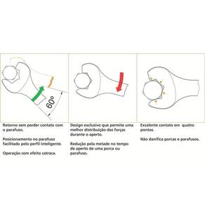 Cabeça usinada. Acabamento cromado. Catraca fosfatizada. Abertura da boca calibrada. 60 dentes. As chaves de aperto são produzidas em aço ligado com cromo vanádio (Cr-V), e após submetidas a testes rigorosos de torque para atender a norma DIN 1711-1.O teste de dureza é realizado em vários pontos para assegurar a resistência ao desgaste da chave durante o uso ininterrupto. Afrouxar e apertar parafusos e porcas sextavadas e quadradas. Sua forma construtiva permite apertar parafusos e porcas sem precisar tirar a chave para encaixá-la a cada movimento, o mesmo acontece se iner a chave para afrouxar. Lado estrela possui mecanismo com catraca que permite realizar trabalhos com mais agilidade e facilidade do que uma chave estrela comum. Catraca com construção robusta que permite dar apertos finais conforme DIN-ISO 1711-1.As ferramentas são produzidas e testadas conforme normas específicas.