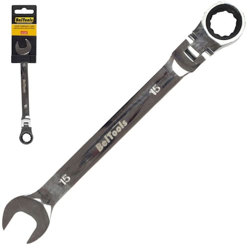 Chave combinada com catraca articulada 15mm - Beltools Descrição: Produzida em aço cromo vanádio, proporcionando maior resistência e durabilidade. Conta com acabamento cromado fosco que oferece ótimo acabamento e maior proteção contra oxidação/corrosão. Possui sistema de catraca articulada que permite a realização trabalhos com mais agilidade e facilidade em locais de difícil acesso, sem a necessidade de retirar a chave para novo movimento. Indicação: Indicada para apertar e soltar porcas e parafusos sextavados. Nunca utilizar prolongadores sobre a chave, pois isso aumentará o torque aplicado e diminuirá a vida útil da ferramenta. Não utilizar o lado com catraca para o aperto final. Medida: 15mm. Comprimento: 200mm. Material do corpo: Aço cromo vanádio. Acabamento: Cromado fosco.
