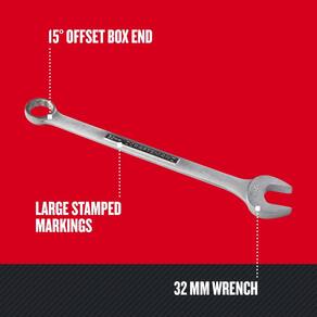 CRAFTSMAN Chave combinada métrica de 12 pontos de 32 mm (CMMT42936) - Resistente à corrosão: acabamento cromado para resistência à corrosão - Engajamento rápido: extremidade da caixa de 12 pontos para engate rápido com fixador - Liberação da articulação: deslocamento da extremidade de 15 caixas para folga adicional da articulação - IDENTIFICAÇÃO FÁCIL: Grandes marcações para identificação rápida da chave de combinação - Atende ou excede as especificações ASME